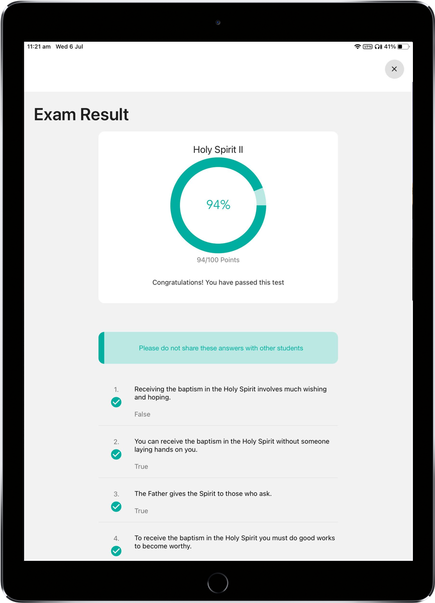 Each Course has 1x multi-choice exam. You get instant exam results, even while offline.